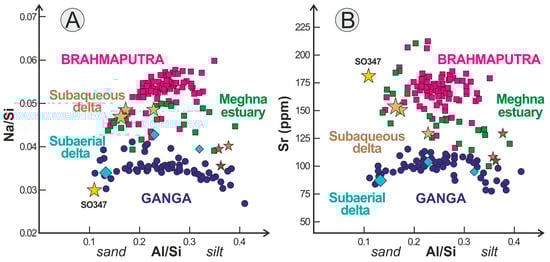 Geochemical discrimination between Ganga and Brahmaputra provenance. Brahmaputra sediments contain more plagioclase and epidote and, therefore, more Na (A) and Sr (B). Subaerial-delta sediments are akin to the Ganga, whereas subaqueous-delta sediments are akin to the Meghna estuary and to the Brahmaputra for sand but closer to the Ganga for fine silt. Sample SO347 is as low in Na as Ganga sand, Al poor because of the winnowing of clay, and Sr rich because of common calcareous ooids and bioclasts. The size of symbols is roughly proportional to the grain size for subaerial and subaqueous delta samples.