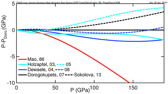 Ambient temperature equations of state (EoS) K) describe the evolution of bonding in solids under high compression. In static high-pressure devices such as diamond anvil cells (DACs), the unit cell volume V is measured with X-ray diffraction (XRD) and the pressure P is estimated using a pre-calibrated gauge. In the 2000s, the calibration of the most widely used gauge in DACs, ruby luminescence, has been updated on the basis of new measurements made in quasi-hydrostatic pressure transmitting media [1,2,3,4,5]. It has been suggested that the historical calibration by Mao et al. (hereafter noted as Mao 86) [6] underestimates the pressure by some 8% at 150 GPa, as represented in Figure 1. As a result, the EoS measured under quasi-hydrostatic compression published before, or during the period of ruby metrology updates have to be corrected.