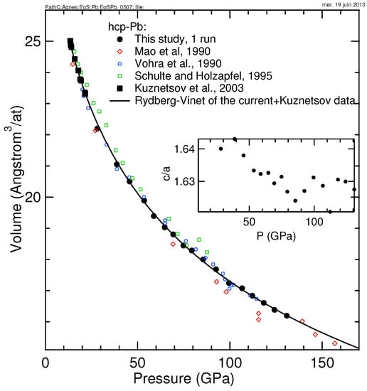 Lead adopts a fcc phase under ambient conditions and transforms to a hcp phase by cold compression to ∼14 GPa [18]; hcp-Pb partially transforms to a bcc phase above 107 GPa [19]. bcc-Pb is also observed below the melting line around 44 GPa and above, suggesting a negative hcp-bcc Clapeyron slope [20]. P-V data published in the 1990s have been collected with samples compressed directly between the diamond anvils [19,21,22], while Kuznetsov et al. [18] measurements have been performed with a sample compressed in a pressure transmitting medium (NaCl), which was also used as a pressure gauge with Brown scale [23]. The different experimental conditions and techniques yield different scatter of the P-V data (Figure 2). Due to their large scatter and a likely bias due to non-hydrostatic compression [24], I have not taken into account the data of [19,21,22] to obtain EoS parameters.
