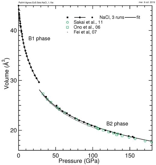 - Sakai, T.; Ohtani, E.; Hirao, N.; Ohishi, Y. Equation of state of the NaCl-b2 phase up to 304 GPa. J. Appl. Phys. 2011, 109, 084912. [Google Scholar] [CrossRef]