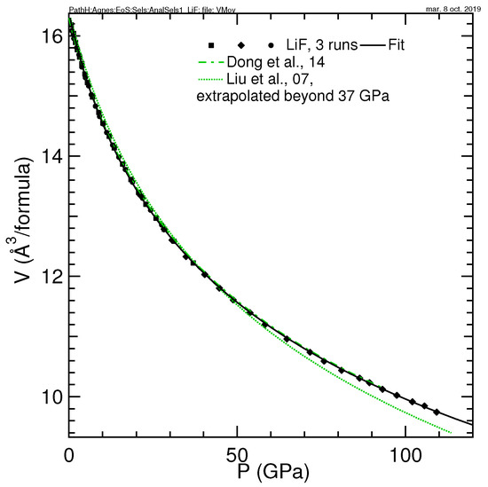 The compression curve of LiF has been measured in three runs (see Table 4). The samples were single crystals, compressed in helium. LiF remained in the B1 phase in the scanned pressure range (0.7–109 GPa). Its compression behavior (see fitting parameters for these three runs in Table 1) agrees well with one recent study up to 92 GPa [29], but not with another one to 37 GPa [30]. The disagreement is more obvious when this EoS is extrapolated in the Mbar range (see Figure 4). It can be noted that in Liu et al. [30], the fitted bulk modulus is 12% higher than its ultrasonic value, 64.3 GPa [31]; the current fitted bulk modulus agrees with the ultrasonic one.