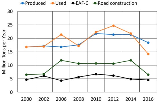 After an initial stationary consumption of steelmaking slag by employing the whole amount of produced material, since 2010 the production of slag has increased by about 25% and its use has overcome the stocks of about 3%, reaching is maximum in 2008 (25 Mt/y of recycled slag). The employment of steel slag as road construction material followed the same trend, now representing the 45%–50% of the whole amount of the recycled slag. In this scenario, electric arc furnace carbon steel slag (EAF-C slag) production oscillates around 5 Mt/y (Figure 1).