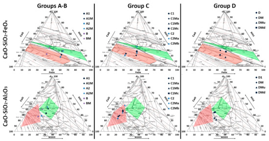 Two different slags featured by having a high fraction of CaO (~40 wt %), low concentration of FeO (<20 wt %), and MgO (3–5 wt %) were been investigated (C1 and C2, Table 3) from batch C. Quartz addition contributed to the dilution of the CaO concentration and the reduction of the slag basicity. Among the stabilized slags, only the C2Ma sample seemed to reach a chemical composition that fell within the green regions, at least in terms of the CaO-SiO2-FeOx diagram (Figure 2).