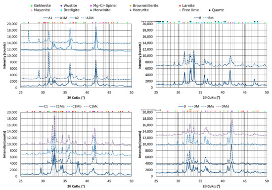 From a crystallographic point of view, the modified slag (sample DM) did not differ significantly from the as-received form (sample D) (Figure 3). The identified phases within all the samples were larnite, wustite, mayenite, and hercynite (an iron–aluminum spinel with composition FeAl2O4). Peaks associated with brownmillerite were also identified in both as-received and stabilized slag, whereas only few reflections associated with gehlenite were found in the treated slag. This means that this last phase was in amounts too small to assure enough hydrophobicity against water. This was better highlighted in SEM pictures, where it was very hard to observe gehlenite grains within the microstructure (Figure 4). Once again, the residual presence of mayenite in the modified samples was a clear index of a lack of reaction between quartz and molten slag, supporting the main conclusion that the stabilization treatment can only really be effective if the slag is collected in a pot.