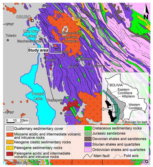 The Huanuni district (Oruro department, Pantaleón Dalence province) is located 275 km SE of La Paz, in the central part of the Eastern Cordillera of the Bolivian Andes (Figure 1). The Eastern Cordillera is composed of Ordovician to Cretaceous sedimentary sequences, comprising thick black shales, siltstones, limestones, sandstones, slates and quartzites (Figure 1 and Figure 2; [22]). These were regionally affected by NNW–SSE striking fault and fold systems [23], possibly due to the Famatinian orogeny and reactivated during the Andean. The sedimentary package is affected by low-grade regional metamorphism related to the Famatinian orogeny. Intrusions of Miocene acid stocks and domes occur in the central part of the Eastern Cordillera, and they are partly covered by ignimbrites, which are late Miocene in age [22,24,25,26,27].