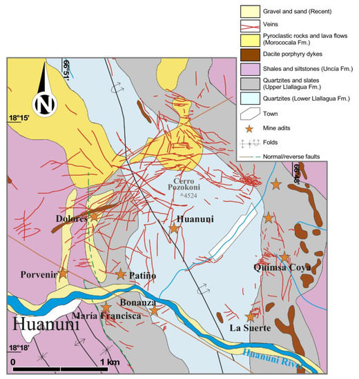The polymetallic deposits are found dominantly on the eastern flank and the nucleus of the locally overturned (towards the SW) Pozokoni anticline and are hosted by rocks of the Llallagua and Uncía formations [31]. Miocene porphyric dikes, approximately N-S striking, crop east of the Pozokoni anticline and extend for over 2 km (Figure 2). These are inferred as the most likely source for the hydrothermal polymetallic deposits [21]. A similar dike also occurs at the Dolores mine, on the western side of the mining district, striking WSW–ENE and over 500 m long, and a smaller one on the northern part of the district. All these dikes occur peripherally to the mineralised area. Nevertheless, the occurrence of a blind intrusion below Cerro Pozokoni (Huanuni mine; Figure 2) within the core of the homonymous anticline is inferred [21].