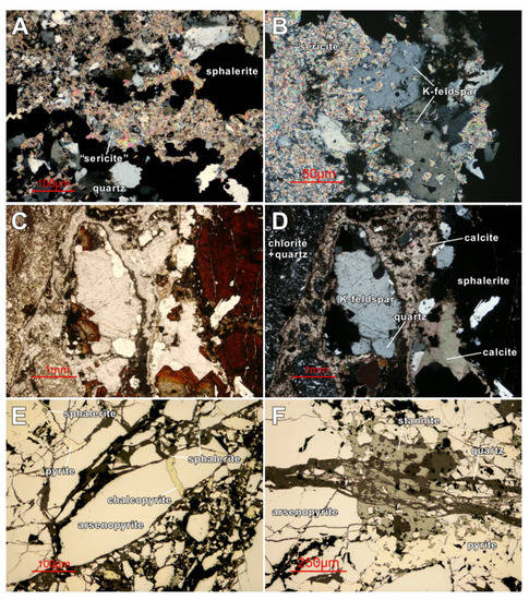 Hydrothermal alteration assemblages are poorly developed in host rocks (mainly quartzites, sandstones and shales) due to the low reactivity between them and hydrothermal fluids. Therefore, their spatial distribution cannot be clearly determined from the currently available surface and underground exposures, although indicated widespread silicification and quartz-sericite alteration, with less consistent argillic alteration, pyritization and tourmalinization [38]. Quartz, schorl, potassium feldspar (not adularia), “sericite” (essentially fine-grained muscovite), chlorite (chamosite), epidote, calcite, and kaolinite are more conspicuous as vein material than as alteration minerals in host rocks (Figure 3). Alunite, dickite, halloysite and nacrite, although not found in this study, have been also reported [16,39]. Monazite-(Ce) is strongly associated with “sericite”, and stetindite with chlorite. The occurrence of potassium feldspar as vein material may stand for potassic alteration assemblages. Pyrophyllite has been identified by XRD in the central sector in our study and indicates the occurrence of advanced argillic alteration. Kaolinite also occurs as a late alteration mineral, possibly as part of argillic alteration assemblages. “Sericite” is commonly observed in association with quartz and sulphides (Figure 3A), and may occur replacing previously formed hydrothermal potassium feldspar (Figure 3B). The latter is suggestive of phyllic alteration developed on earlier potassic alteration. Chlorite, epidote and calcite are closely associated and constitute propylitic alteration assemblages that may also include montmorillonite. Propylitic assemblages may also develop on earlier potassic assemblages (Figure 3C,D). All alteration and ore-bearing assemblages are susceptible to experiencing fracturing and non-hydrothermal brecciation (Figure 3E,F), thus favouring the emplacement of later associations in all the mineralised areas in the Huanuni district.