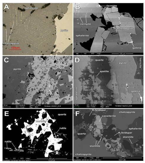 Zn- and Sn-rich assemblages are often spatially associated with apatite (Figure 4D) and potassium feldspar (Figure 4F), at least in the Central area, which suggests that such assemblages are associated with potassic assemblages. Rutile is a characteristic mineral of the peripheral areas of the mineralisation, replaced by quartz and wurtzite (Figure 4E).