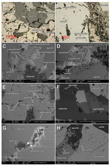 Cassiterite and stannite are the most abundant Sn minerals in the deposit (Figure 5). Cassiterite is relatively abundant in the Central area, generally as passively precipitated vein material along with quartz and pyrrhotite or arsenopyrite (hence, an early mineral (Figure 5C,F,H)) as euhedral to subhedral crystals or, less frequently, in association with pyrite or stannite (Figure 5C,D,G). It is commonly replaced by stannite (with or without schorl (Figure 5B–D,F–H)). Cassiterite is relatively scarce in peripheral areas of the deposit, where it systematically postdates early Zn-rich associations as anhedral crystals replaced, in turn, by later sulphides and sulphosalts. Siderite is also common in the Central area, in association with cassiterite (Figure 5F,G), intergrown with rare otavite (Figure 6E), due to the alteration of pyrrhotite, and is a scarce mineral in the peripheral zones of the deposit.