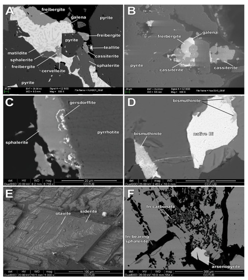 Besides the silicates mentioned above, the minerals that constitute hypogene ore associations in the deposit are dominantly sulphides and sulphosalts, oxides, wolframates, phosphates, and carbonates (Figure 4, Figure 5 and Figure 6). These are consigned in alphabetical order for each of the groups above. Sulphides are acanthite [Ag2S], arsenopyrite [FeAsS], bismuthinite [Bi2S3], černýite [Cu2CdSnS4], chalcopyrite [CuFeS2], cobaltite [CoAsS], galena [PbS], gersdorffite [NiAsS], marcasite [FeS], pyrite [FeS2], pyrrhotite [Fe1−xS], rhodostannite [Cu2FeSn3S8], sphalerite and wurtzite [ZnS], stannite–kësterite [Cu2FeSnS4–Cu2ZnSnS4], and teallite [PbSnS2]. Sulphosalts are cervelleite [Ag4TeS], freibergite [Ag6(Cu4Fe2)Sb4S13−x], matildite [AgBiS2], proustite–pyrargyrite [Ag3AsS3–Ag3SbS3] and treasurite [Ag7Pb6Bi15S32]. Oxides are cassiterite [SnO2], hematite [Fe2O3], and rutile [TiO2]. Wolframates are the endmembers of wolframite, ferberite [FeWO4] and hübnerite [MnWO4]. Phosphates are fluorapatite [Ca5(PO4)3F], and monazite-(Ce) [(Ce,La,Nd,Th)PO4]. Carbonates are calcite [CaCO3], siderite [FeCO3], and otavite [CdCO3]. There is also fluorite [CaF2], native bismuth [Bi], and stetindite [Ce4+SiO4], a considerably rare mineral.