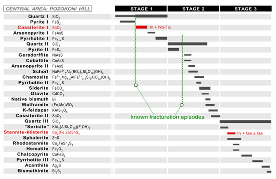 Paragenetic sequence in the Central area of the Huanuni deposits, or Pozokoni Hill area. Minerals highlighted in red are those with significant concentrations in In, Ge, Ga, Nb and Ta.