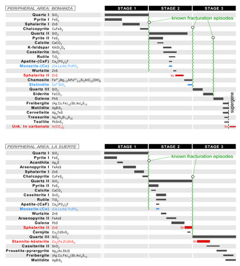 The paragenetic sequence in the peripheral areas of the Huanuni deposits (Bonanza and La Suerte areas). Minerals highlighted in red are those with significant concentrations in In, Ge and Ga, and Ce-bearing minerals in blue.