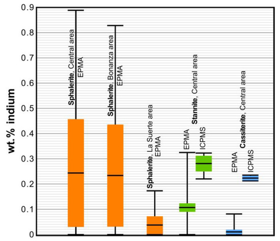 Sphalerite from the three mineralised areas was analysed by means of EPMA. Its maximum iron contents occur in the Central area: up to 11 wt.% Fe (average 6.62 wt.% Fe) in the Bonanza area, up to 11.97 wt.% Fe (average 9.26 wt.% Fe) in the La Suerte area, and up to 21.8 wt.% Fe (average 9.5 wt.% Fe) in the Central area (Table 1 and Table S1). Most indium contents in sphalerite (Figure 9, Table 1 and Table S1) are below the detection limit, but some grains are up to 0.88 wt.% In (average 0.24 wt.% In) in the Central area, up to 0.82 wt.% In (average 0.2 wt.% In) in the Bonanza area, and up to 0.17 wt.% In (average 0.02 wt.% In) in the La Suerte area. Therefore, the highest indium concentrations occur in stage-2 sphalerite in the Central and Bonanza areas. Cadmium contents in sphalerite are up to 0.7 wt.% Cd in the Central area but attain the highest average values in the Bonanza area (0.43 wt.% Cd).