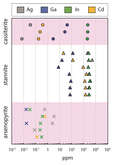Stannite–kësterite from the Central area shows several elemental substitutions, ranging between 0.1 wt.% and 6.31 wt.% Zn, up to 0.29 wt.% Ag, up to 0.13 wt.% Ge, and up to 0.32 wt.% In (average 0.12 wt.% In; EPMA; Table S1). LA-ICP-MS analyses in stannite–kësterite (Figure 9 and Figure 10, Table S2) yielded similar values to those obtained by EPMA (Table S2).