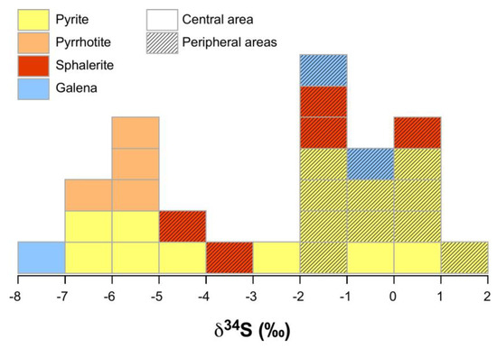 Histogram of sulphur isotopic composition (δ34S) of sulphide minerals in the Huanuni deposit, relative to the VCDT standard.