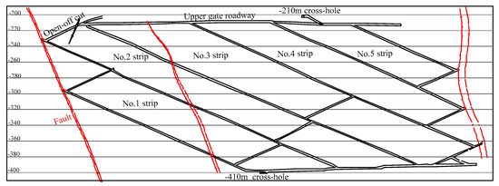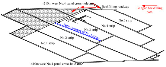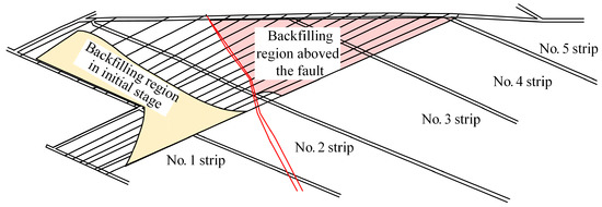 Considering the backfilling process and moving area obtained by the simulation, the backfilling form in the No. 845 working face is inferred and demonstrated in Figure 13. In the initial mining stage, the fault was the main geological factor influencing the backfilling ratio. When the No.1 and No.4 strip were exploited together, the inclined length of the working face dramatically increased, which began to be the main factor influencing the backfilling ratio. Thus, the backfilling ratio can be improved by shortening the inclined length of the working face. A new inclined roadway in the west No. 3 strip was excavated at 120 m from the upper head of the working face, as shown in Figure 14. The working face was divided into two parts. The upper half of the working face was exploited first. The field test indicated that the backfilling ratio in the subsequent mining stage was mostly above 70%, which showed that optimizing the roadway layout and shortening the inclined length of the working face can significantly improve the backfilling ratio.