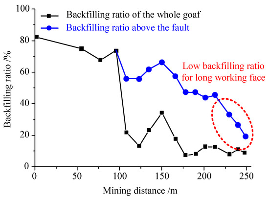 When the working face passed a fault, subject to the impact of the fault movement, the moving of the gangue in the goaf was constrained, and the backfilling decreased significantly. At this time, if only the upper area above the fault was considered in the goaf, the backfilling ratio still stayed above 50%.