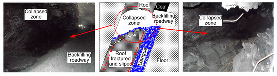 At the early mining stage of the 845 working face, the gangue backfilling ratio was very high, and the corresponding roof deformation was relatively small, with only a slight amount of bending. But when the gangue backfilling quantity decreased to a low value, the controlling effect of the gangue on the deformation of the roof could not fully be brought into play. There was a large-scale roof fracture in the upper gate roadway (i.e., backfilling roadway) of the 845 working face. The fracture depth reached 4 m in the roof, which was almost the thickness of the immediate roof as shown in Figure 4. In contrast to a horizontal or slowly inclined coal seam, the slip of the fractured roof along the incline direction of rock strata resulted in a large collapsed area on the roof at the upper gate roadway [35].