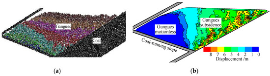 In the early mining stage of the working face, the gangue could not be backfilled in the lower part of the open-off cut because the dip angle of the cut was smaller than gangue’s angle of repose. The quantity of the gangue backfilled in the goaf was lower, and it was mainly concentrated directly above the working face, as shown in Figure 6a. After the mining of the coal seam, the gangue in the surface had larger displacement, and the gangue above the working face slipped toward the coal-running slope, as shown in Figure 6b. This stage was named the landslide stage.