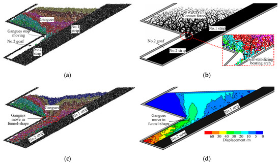 After the working face advanced 100 m, the width of the connected space of the No. 1 and No. 2 strips extended from 10 m to 20 m. The self-stabilizing bearing arch formed at the prior stage was damaged, and more gangue could backfill in the goaf of the No. 2 strip, as shown in Figure 8c. Different from the small-scale subsidence stage, the displacement of gangue in the middle of the No. 1 strip was larger than the gangue on the two sides, and the gangue upon the coal-running slope still remained motionless, as shown in Figure 8d. The backfilling process and displacement distribution of gangue backfilling in this stage were similar to an inclined funnel, so this stage was named the funnel-shaped subsidence stage.
