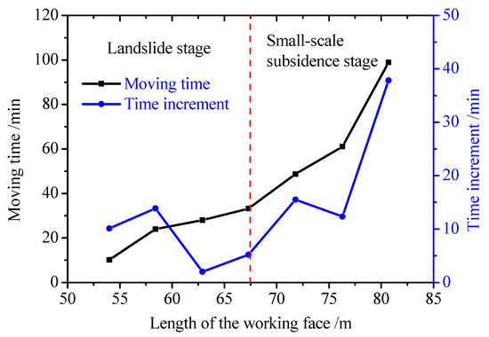 Overall, with the increase of the inclined length of the working face, the gangue moving time tended to increase gradually, and the time increment between mining stages increased too.