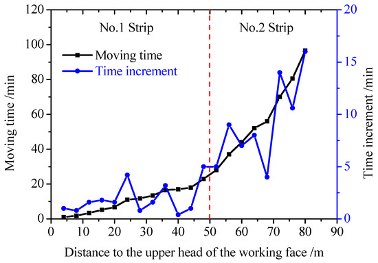 Taking the stage of the working face mining as 120 m as an example, the vertical height of the working face was about 80 m, and the working face was exploited from the lower head to the upper head. The time of the gangue moving was counted separately every time in order to obtain the variation curve of the gangue moving time, as shown in Figure 12. When mining the coal at the upper head of the working face, the gangue moving time was shorter than 10 min. With the increase of the distance from the coal exploited location to the upper head, the gangue moving time increased. When exploited at the end head, the gangue moving time was longer than 90 min.