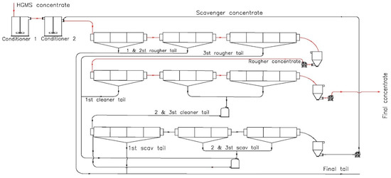 In the flotation circuit of the Chadormalu plant, SS is used as the iron oxides depressant. The dephosphorization flotation circuit consists of rougher, cleaner, and scavenger circuits (each having three stages) (Figure 1). Flotation feed is the concentrate which has been produced from a high-gradient magnetic separator (HGMS). The rougher and cleaner stages consist of 10 cells with 11 m3 capacity. The scavenger stage consists of 10 cells with 3.3 m3 capacity. To compare SS vs. SCS at the industrial scale, three parallel lines (out of five lines) were used based on different conditions (Table 3). During the tests, a homogeneous stockpile was prepared and fed to the plant. The feed rate for the experiments was close to the common plant feed rate. The flotation tests were run on two consecutive days. In the first 24 hours the SS, and in the second 24 h the SCS depressant were examined (Table 3).