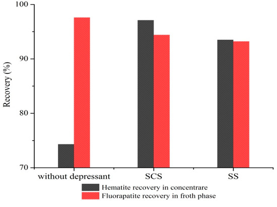 Micro-flotation outcomes (Figure 2) indicate that hematite recovery in the absence of depressants is about 74%, while by adding depressants it increases significantly (the iron recovery increases by more than 20%). Adding depressants slightly decreases the flourapatite recovery in the froth phase. This slight drop in fluorapatite floatability is probably due to the interactions between the collector and the depressants [12]. The depression of hematite by SCS is 3.5% higher than SS (Figure 2). Moreover, in the presence of SCS, the fluorapatite recovery in froth phase is higher than SS. These results demonstrate that (i) the presence of depressant generally has no significant effect on the fluorapatite floatability, and (ii) the SCS is more efficient than SS.
