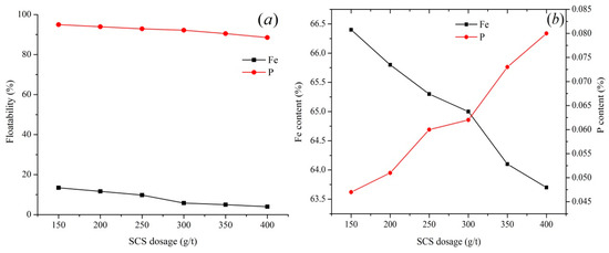 Effect of the SCS concentration on floatability (a) and grade (b) of Fe and P.