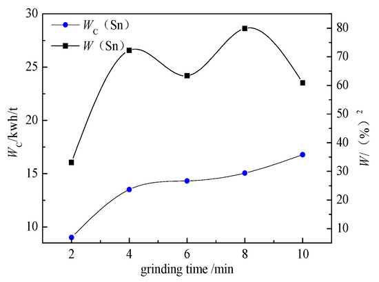 Through the analysis of Table 4, Table 5 and Table 6 and Figure 1 and Figure 2, the grinding optimization degree of the cassiterite and sulfide ore are the greatest when the grinding time is set at 4 min and 8 min, respectively. This finding indicates that the cassiterite ore possesses good brittleness, low hardness and is easy to grind, while the sulfide ore has high hardness and is difficult to grind. Accordingly, the grinding optimization method can be proposed, that is, after the sequencing of tin grinding for 4 Min, another 4 min grinding is conducted to sort the sulfide ore. This process can alleviate the conflict of cassiterite overgrinding and sulfide ore undergrinding, and the grinding energy can also be utilized most efficiently.