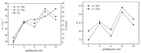 Effect of grinding time on the the W(Pb), W(Zn), M(Pb) and M(Zn).
