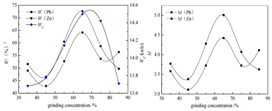 Effect of grinding concentration on the the W(Pb), W(Zn), M(Pb) and M(Zn).