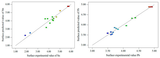 The surface test values, model predictive values and residuals of Sn, Pb and Zn metal elements are shown in Figure 7 and Figure 8, respectively. As shown in Figure 7 and Figure 8, the experimental values and predicted values have a high fitting degree, indicating that the fitting of Equations (6), (7), and (8) can well describe the relationship between the surface test values and grinding parameters.