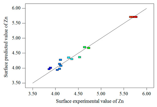 Based on the selected grinding parameters, 17 test combinations of three factors and three levels were designed from the Box–Behnken model. The test sequence was randomly generated by Design Expert 8.0.7 software, and the experimental value ranges of Sn, Pb and Zn were 1.87–5.78, 3.50–4.93, and 3.86–5.77. The analysis shows that the correction coefficient and complex correlation coefficient of three metals in Sn, Pb and Zn are the highest. These two models can be used as the regression equation between the surface test value and the grinding parameter. Through the Design Expert 8.0.7 software analysis and calculation, the fitting equations for Sn, Pb and Zn between the surface test value and the grinding parameter are shown in Equations (6), (7) and (8), with X1, X2, and X3 representing encoded values.