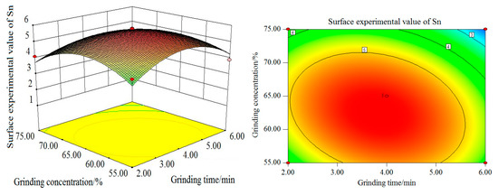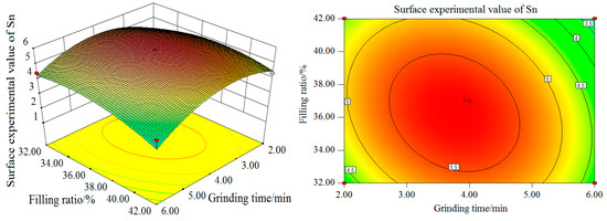 As shown in Figure 9, Figure 10 and Figure 11, with the increase of grinding time and grinding concentration, the Sn surface test value firstly increases and then decreases, with the value reaching its maximum at grinding time of 4 min and grinding concentration of 65%. In terms of the single factor, the grinding time and grinding concentration have a significant influence on the experimental value of the Sn curved surface. As can be seen from the contour map, the interaction between grinding time and grinding concentration is more significant. The influence curve between the filling ratio and grinding time on the experimental value of the Sn curved surface also shows a trend of increasing first and then decreasing. When the grinding time is 4 min and the filling ratio is about 37%, the maximum Sn surface test value can be obtained. In terms of the single factor, the influence of grinding time on the experimental value of the Sn surface is greater than that of the filling ratio.