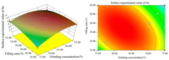 The contour map illustrates that the interaction between the grinding concentration and the filling ratio is not significant. In conclusion, the order of the influence degree on the Sn surface test value from high to low is as follows: grinding concentration, grinding time and filling ratio. The interaction between grinding concentration and filling ratio is weak, while the interaction between the grinding time and grinding concentration and between the grinding time and filling ratio, is stronger.