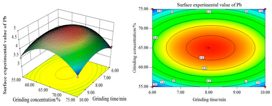 As shown in Figure 12, Figure 13 and Figure 14, with the increase of grinding time and grinding concentration, the Pb surface test value firstly increases and then decreases, reaching its maximum when the grinding time is at 8 min and grinding concentration at 65%. From the perspective of single factor, the influence of grinding time and grinding concentration on the experimental value of the Pb curved surface is remarkable. As can be seen from the contour map, the interaction between the grinding time and grinding concentration is more significant. The influence curve between the filling ratio and grinding time on the experimental value of Pb curved surface also increases first and then decreases. When the grinding time is 8 min and the filling ratio is about 37%, the maximum Pb surface test value can be obtained.