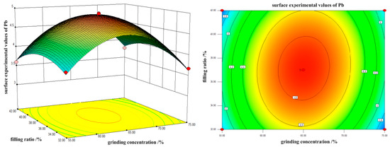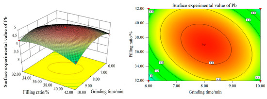 In terms of the single factor, the experimental value of Pb curved surface is significantly affected by grinding time and filling ratio. As can be seen from the contour map, the interaction between the grinding time and filling ratio is more significant. With the increase in grinding concentration and filling ratio, the Pb surface test value increases first and then decreases. The maximum value is reached when the grinding concentration is 65% and the filling ratio is about 37%. From the single factor, the filling ratio and grinding concentration have a significant influence on the experimental value of the Pb curved surface.