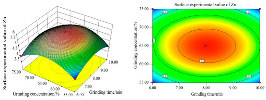 Zn curved surface experimental value and contour map under grinding concentration and grinding time action.