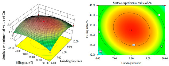 As shown in Figure 15, Figure 16 and Figure 17, with the increase of grinding time and grinding concentration, the Zn surface test value firstly increases and then decreases, reaching its maximum at 8 min of grinding time and 65% of grinding concentration. From the single factor, the influence of grinding time and grinding concentration on the experimental value of the Zn curved surface is remarkable. As can be seen from the contour map, the interaction between the grinding time and the grinding concentration is more significant. The influence curve between the filling ratio and grinding time on the experimental value of the Zn curved surface also increases first and then decreases. When the grinding time is 8 min and the filling ratio is about 37%, the maximum Zn surface test value can be obtained. From the single factor, the influence of grinding concentration on the experimental value of the Zn surface is more significant than that of the filling ratio.