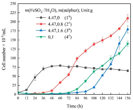 As shown in Figure 1, in medium 1#, the logarithmic phase of the bacteria started at 12 h and ended at 48 h with a peak cell density of 8.0 × 107 cells/mL. There was a slight decrease in bacteria density in the 2#, 3#, and 4# media during the initial growth period, which was attributed to the adsorption of a free population on the surface of elemental sulphur [47,48]. The lag phase of bacteria in the medium with added elemental sulphur was longer than that in the medium using ferrous iron as the sole energy source because of a period of adaptation in the ferrous grown culture to a mixed substrate and sulphur-only environment. The final cell densities for 2#, 3#, and 4# media were 2.1 × 108, 1.8 × 108, and 1.4 × 108 cells/mL, respectively. The cell density in the 4# medium was higher than the maximum density of bacteria in the 1# medium at 156 h. A previous study reported that sulphur-grown cells give a higher yield of carbon dioxide fixation than cells grown on ferrous ions [49]; furthermore, carbon dioxide fixation is the only option available for chemolithotrophic bacteria to generate biomass [50]. Therefore, the density of sulphur-grown cells is higher than that of ferrous-grown cells.