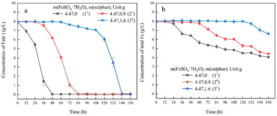 Ferrous ion concentration decreased in the 1#, 2#, and 3# media (Figure 2a) due to the oxidation of ferrous ions to ferric ions by A. ferrooxidans (Equation (1)) [51]. The concentration of ferrous ions in the 1# medium decreased sharply during the first 48 h. The ferrous ions were completely oxidized in the 2# and 3# media at 84 h and 144 h, respectively. When elemental sulphur was added to the medium, the oxidation of ferrous iron was delayed. Previous investigations have shown that ferrous irons and elemental sulphur are used simultaneously by A. ferrooxidans [39,52]. Therefore, an increase in the proportion of sulphur in energy results in an increased delay of ferrous iron oxidation. Figure 2b shows the variation in soluble total iron during cultivation, with a decrease in soluble total iron due to the formation of ferruginous substances such as jarosite [47], which can be expressed as Equation (2). In addition, Fang et al. [41] found that a small amount of iron was taken into cells for synthesis of ferruginous nanoparticles.