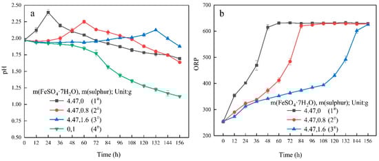 The variation of pH is shown in Figure 3a. In the 1# medium, pH increased from 1.97 to 2.40 at 24 h then decreased to 1.69 at 156 h. This was likely due to the consumption of H+ in the early period when bacteria utilized ferrous iron, as shown in Equation (1). Later decreases were likely due to the abiotic hydrolysis of ferric sulphate (Equation (3)) and the formation of ferruginous substances such as jarosite (Equation (2)). The variation of pH in the 2# and 3# media was also initially increased and then decreased. The decrease was likely due to the abiotic hydrolysis of ferric sulphate and the synthesis of jarosite, as well as the oxidation of sulphur (Equation (4)). In the 4# medium, the pH value decreased slowly in the first 72 h then decreased more significantly. The oxidation of elemental sulphur by A. ferrooxidans is an acid-producing reaction [47], as shown in Equation (4). The ORP increased from 350 mV at 12 h to 620 mV at 48 h in the 1# medium. In the 2# and 3# media, a lag period of 36 h and 108 h was observed before the ORP obviously increased (Figure 2b). The variation in ORP showed a negative correlation with the ferrous concentration.