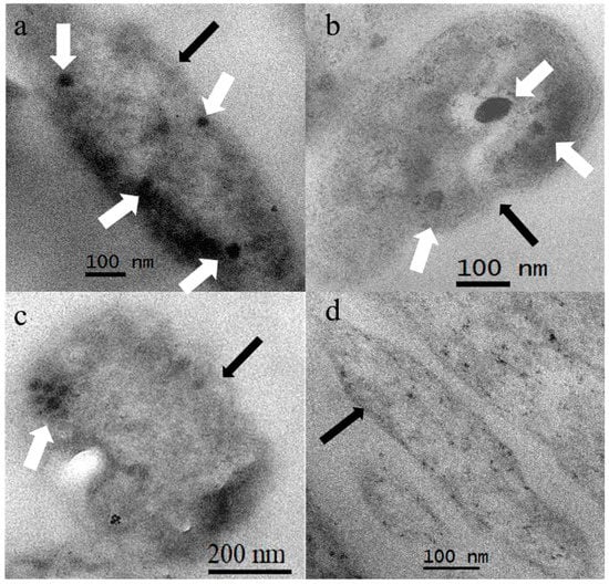 TEM micrographs of individual cells collected from media 1# (a), 2# (b), 3# (c), and 4# (d). White arrows refer to nanoparticles and black arrows refer to the cell wall.