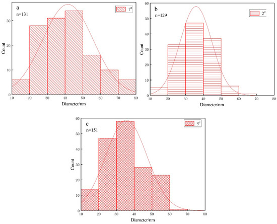 Histograms of the diameter of the nanoparticles synthesized by bacteria in media 1# (a), 2# (b), and 3# (c). n represents the number of nanoparticles analyzed in each medium.