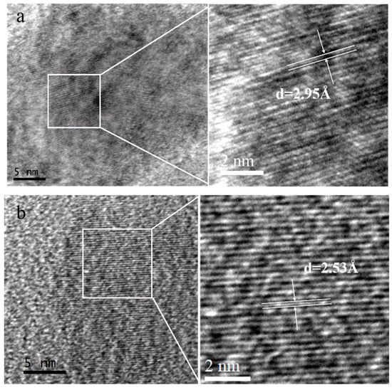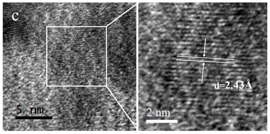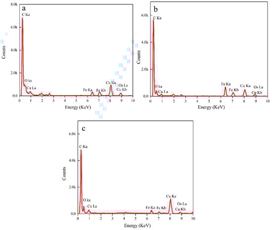 EDX and HRTEM analyses were performed on nanoparticles. Fe and O peaks were present in all three samples, as shown in Figure 6a–c. EDX analysis indicated that nanoparticles were composed of iron and oxygen. Meanwhile, the carbon-coated copper grids explained the carbon and copper peaks, and osmium oxide explained the oxygen and osmium peaks. However, Fang et al. [41] found that nanoparticles synthesized by Ferroplasma thermophilum contained iron, oxygen, and cobalt. Meanwhile, as shown in Figure 7, the lattice spacing of nanoparticles cultured in the media 1#, 2#, and 3# was 2.95 Å, 2.53 Å, and 2.43 Å, respectively. The fringes with spacing clearly corresponded to magnetite, which has been previously demonstrated in A. ferrooxidans [35,42].