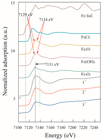 To determine Fe species of nanoparticles, Fe K-edge XANES analyses were carried out. As shown in Figure 8, the spectra of standard Fe-containing compounds showed differences in the peaks’ positions. When we examined the XANES spectra of 1#, 2#, and 3#, we observed a shoulder feature at 7139 eV (green dotted line, Figure 8), which was consistent with Baumgartner’s finding [57]. This shoulder was also observed in the XANES spectrum of poorly ordered ferric phosphates [58]. It has been reported that magnetite formation in magnetotactic bacteria proceeds from disordered ferric phosphate [57]. In our study, the medium contained K2HPO4, hence we speculated the nanoparticle formation in A. ferrooxidans may have proceeded from a ferric phosphate. We also observed a shoulder feature at 7114 eV (red dotted line, Figure 8) and strong peaks at 7131 eV (black arrow, Figure 8). The spectra of Fe2O3 and Fe(OH)3 had two peaks at 7129 and 7134 eV (red arrow, Figure 8). The spectra of Fe3O4 had one peak at 7131 eV (black arrow, Figure 8). Moreover, the spectra of nanoparticles cultured in the media 1#, 2#, and 3# had strong peaks at 7131 eV and had no peak at 7134 eV. Therefore, the spectra of 1# to 3# were more similar to Fe3O4 than Fe(OH)3 and Fe2O3. Overall, by combining the results of EDX, HRTEM, and XANES, it could be inferred that the composition of the nanoparticles was magnetite.