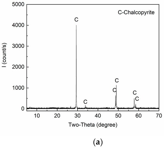 Chalcopyrite, chlorite (clinochlore), and serpentine (lizardite) samples used in this study were purchased from Yip’s Mineral Specimen Factory (Guangzhou, China). X-ray fluorescence (XRF) analysis and X-ray diffraction (XRD) results of three mineral samples are given in Table 1 and Figure 2, respectively. The XRD results were analyzed with the RIR (Reference Intensity Ratio) value method for phase semi-quantitative analysis. The analysis showed that the purities of the mineral samples were 97.19% (for chalcopyrite), 98.82% (for chlorite), and 90.88% (for serpentine). Since the samples were all of the high purity (above 90%), no further cleaning was necessary. The pure mineral samples were first hammered into small pieces and then ground in a ceramic ball mill. The ground samples were dry-sieved to obtain −75 + 38 μm-size fractions for the micro-flotation tests. Next, the samples below −38 μm were further ground to −10 μm (by Sichuan Dewei Weina Technology Co., Ltd., using jet milling, Mianyang, China) for the adsorption tests, zeta potential measurements, and FTIR studies.