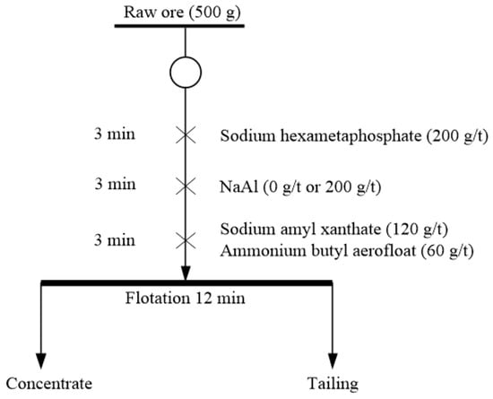 The batch flotation tests were conducted in a 1.5-L XFD-IV single-trough flotation machine (made by Jilin Exploration Machinery Factory, Changchun, China). The real ore containing 1.3% Cu was supplied by Jinchuan Group Ltd. (Jinchang, China). For each test, 500 g of raw ore was wet ground to 75 wt % passing 75 μm with a ball mill. The slurry was transferred into the flotation cell and stirred for 3 min. The sodium hexametaphosphate (200 g/t) and NaAl were added sequentially and conditioned for 3 min of each. Then, sodium amyl xanthate (120 g/t) and ammonium butyl aerofloat (60 g/t) were added together and stirred for 3 min. After the 12-min single-stage rougher flotation, the rougher concentrate and tailing products were filtered, dried, weighed, sampled, and assayed for Cu. Tap water and industrial-grade reagents were used in all batch flotation experiments. The flow sheet and conditions of flotation tests are demonstrated in Figure 3.