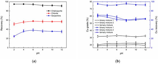 Effect of pH on the flotation behavior of single minerals (a) and mixed minerals (b). [sodium amyl xanthate (SAX)] = 20 mg/L; [methyl isobutyl carbinol (MIBC)] = 20 mg/L; binary mixture 1: the mixture of chalcopyrite and chlorite; binary mixture 2: the mixture of chalcopyrite and serpentine.